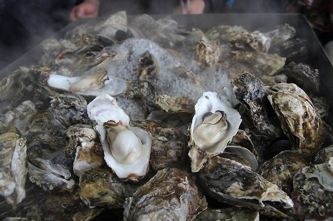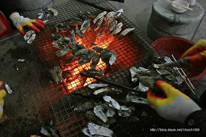| ▲ 장작을 이용해 직화로 굴을 구워먹는 전남 장흥 남포의 직화구이다. |