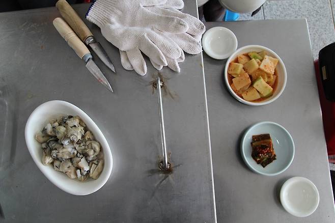 | ▲ 굴을 까먹는 도구인 목장갑과 식도다. |