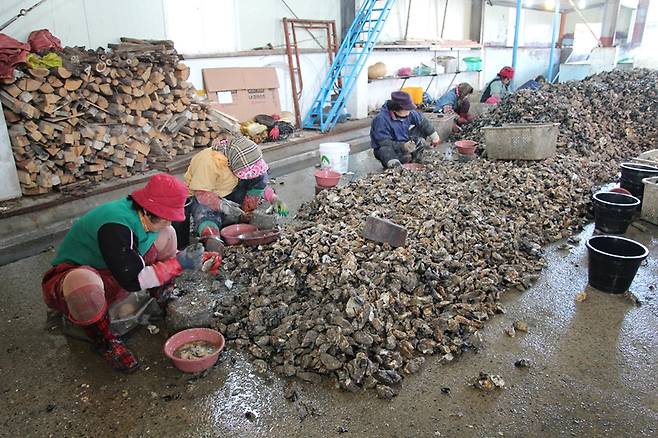 | ▲ 할머니들이 조새를 이용해 굴을 까고 있다. |