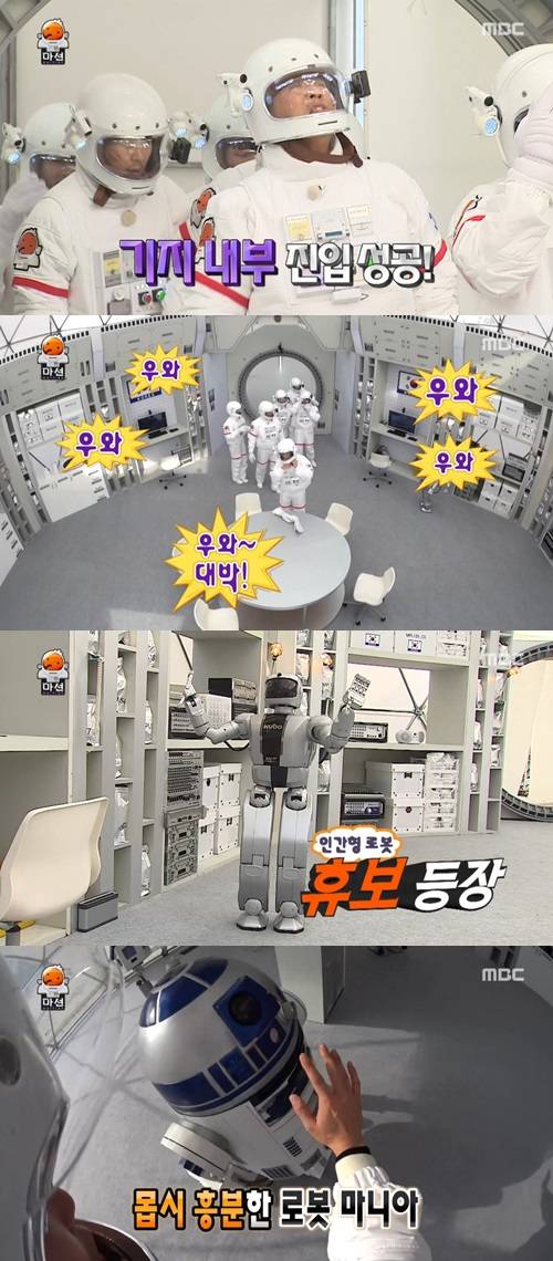 로봇 휴보와 R2D2 등이 멤버들을 맞이했고 멤버들은 금방 기지에 적응했다. 특히 박창훈PD가 천문학 박사로 등장해 멤버들에게 화성에 대해 설명해줬다. 박창훈 박사는 "여러분은 화성에 첫발을 내딛은 인류다. 화성이 살만한 곳인지 직접 체험하게 됐다. 짐부터 풀고 화성에서 살아갈 방법을 논의하라"며 첫번째 미션을 줬다. (사진=MBC '무한도전' 캡처)