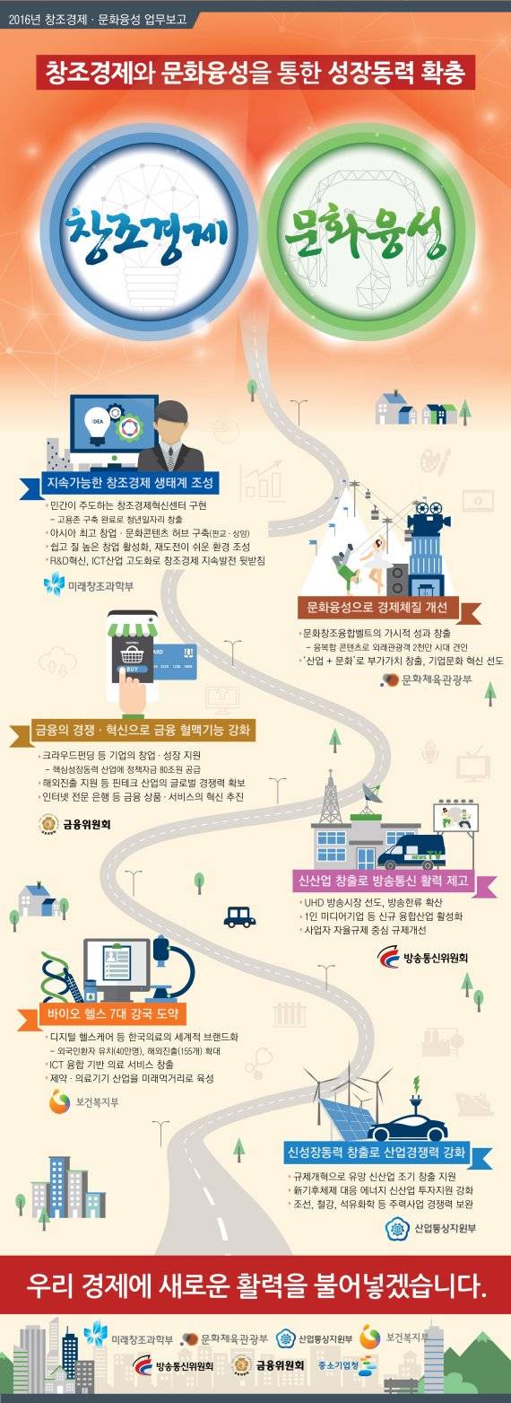 미래창조과학부와 문화체육관광부, 금융위원회, 산업통상자원부, 보건복지부, 방송토신위원회와 함께 6개 부처는 18일 공동으로 '창조경제와 문화융성을 통한 성장동력 확충' 실현을 위한 업무 계획을 대통령에게 보고했다. 6개 부처는 '창조경제와' 문화융성'을 두 축으로 '지속가능한 창조경제 생태계 조성'과 '문화융성을 통한 경제체질 개선' 정책방안을 마련했다.