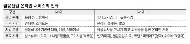 하지만 핀테크와 IT, 유통 기업이 주도하는 2세대 디지털 금융은 온라인 플랫폼과 소셜미디어를 기반으로 금융회사를 거치지 않고 소비자들이 직접 금융 서비스를 주고받는 사업 모델로 승부를 건다.