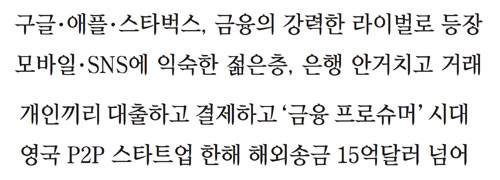 영국 소비자들은 얼마 전부터 5%에 달하는 해외 송금 수수료를 10분의 1로 줄였다. 핀테크 업체인 트랜스퍼와이즈가 제공하는 P2P(개인 간 금융 거래) 서비스 덕분이다. 영국인들은 2011년 창업한 이 회사를 통해 기존 금융회사를 거치지 않고 연평균 15억달러 규모의 해외 송금 거래를 하고 있다.