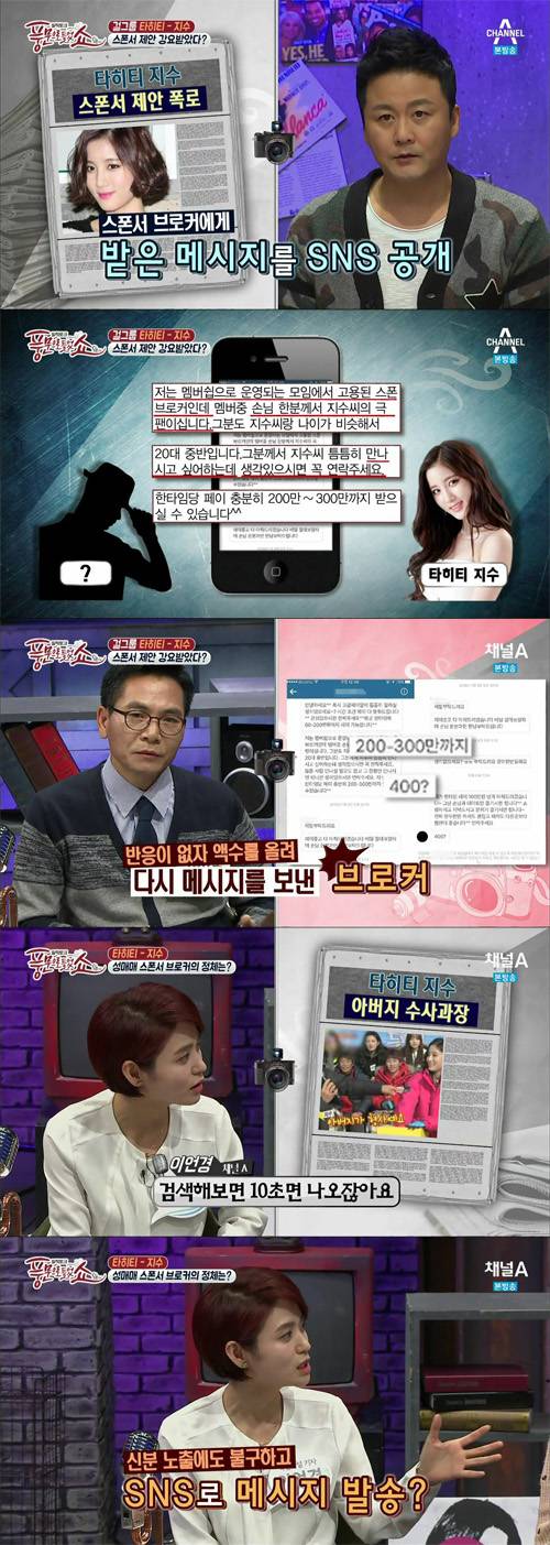 18일 밤 방송된 종합편성채널 채널A '풍문으로 들었쇼'(이하 '풍문쇼')에서는 걸그룹 타히티 지수의 스폰서 제안 폭로에 대한 이야기를 나눴다.