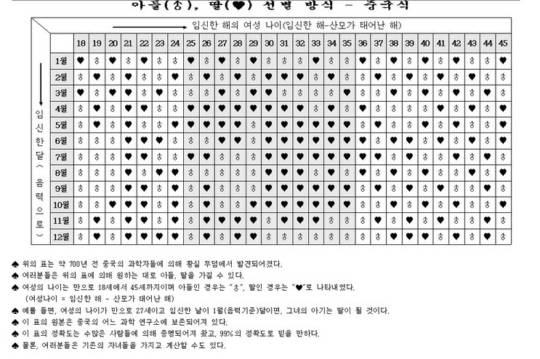 온라인 상에서는 '중국 황실의 태아 감별법'이라는 표가 돌아다니기도 한다.