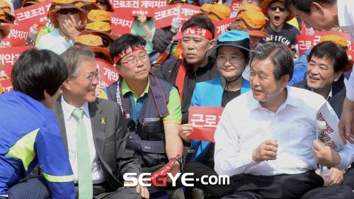 | 서울 여의도공원 문화마당에서 열린 한국노총 5.1 전국 노동자대회에서 새누리당 김무성 대표와 새정치민주연합 문재인 대표가 참석해 이야기하고 있다. 세계일보 자료사진 |