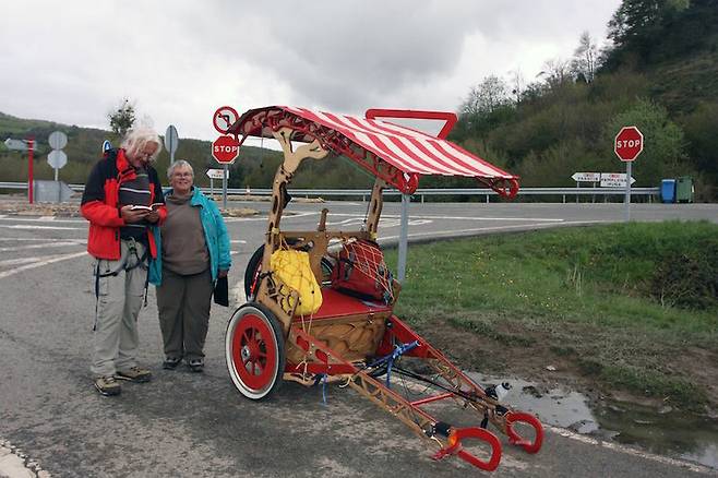 | ▲ 오스트리아에서 온 부부 순례자 몸이 불편한 아내를 인력거에 태우고 백발의 남편이 인력거를 끌며 순례하고 있다. |