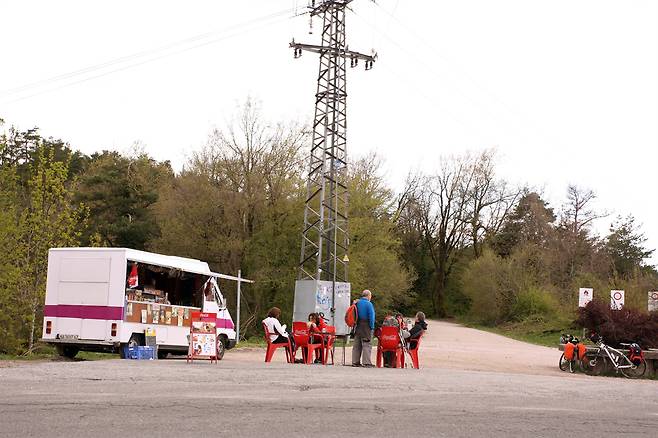 이름이 살짝 웃겼지만, 그 풍경이 왠지 기대됐었는데 막상 도착한 에로 봉은 좀 허망했다. 큰 도로가 바로 옆을 지나는 것도 그렇고, 송전탑 아래 빨간 의자를 놓고 콜라를 파는 트럭도 그렇고. 발 아래로 스페인의 산자락이 멋지게 펼쳐진 산 정상일 거라는 기대가 확 무너졌다.