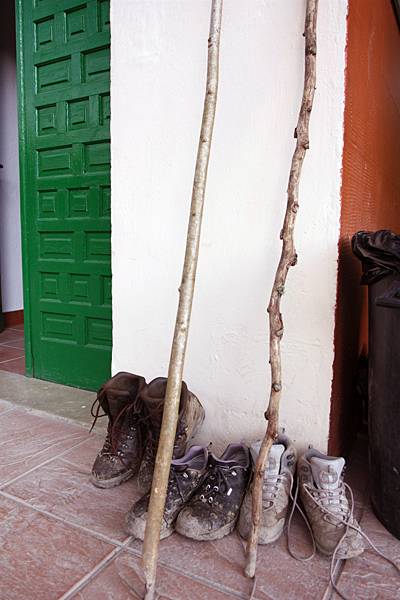 | ▲ 알베르게 앞 순례자들의 신발과 지팡이가 고된 하루를 보여준다. |