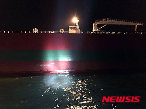 【여수=뉴시스】김석훈 기자 = 21일 오전 1시19분께 전남 여수시 돌산읍 돌산도 동쪽 17.4㎞ 해상에서 사천선적 24t급 어선 N호(근해자망)가 6만5000t급 바하마 선적 원유운반선 S호에 충돌했으나 인명피해나 유류오염사고는 발생하지 않았다. 사진은 S호 좌현에 생긴 3m길이의 흠집. 2016.01.21. (사진=여수해경 제공)