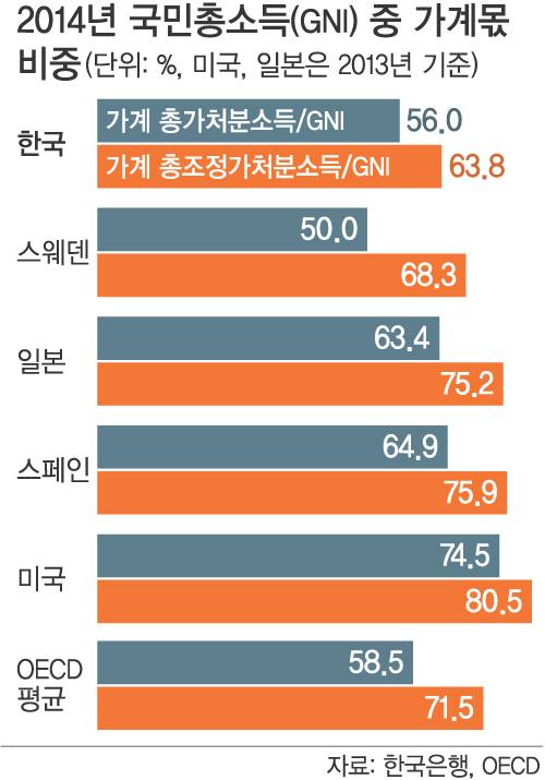 정부의 역할은 경제협력개발기구(OECD)국가의 가계소득 통계에서 확연히 드러난다. 예컨대 스웨덴의 경우 GNI중 가계 가처분소득 비중은 2014년 50%로 한국(56.0%)보다도 낮다. 그러나 교육·의료·복지 등 사회적 현물이전을 가계소득으로 잡아서 본 궁극의 가계 실질소득인 조정처분가능소득으로 보면 이 비율은 68.3%로 한국(63.8%)을 추월한다. 복지정책 등 정부의 소득재분배 정책으로 가계소득 통로가 넓어진 것이다.