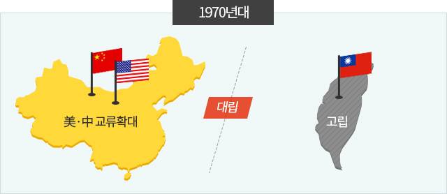 중국과 대만의 평행선 같은 관계가 미국으로 인해 달라지는 시기가 70년대다. 69년 미국 닉슨 정부가 중국과의 대화채널을 개방한 것을 시작으로 美·中 두 나라는 차츰 교류의 횟수를 늘려간다. 베트남전으로 골치를 앓던 미국이 현실적 필요에 의해 공산권 국가인 중국과의 관계 개선 시도했고, 중국 역시 소련과 관계가 악화되자 이에 대한 대안으로 미국에 공을 들이기 시작한 무렵이었다.