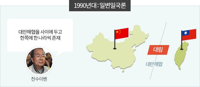 양안관계는 대만의 리덩후이 총통과 그 뒤를 이은 천수이볜 총통의 취임으로 다시 악화된다. 리덩후이 총통은 양안관계를 국가대 국가의 관계로 보는 양국론을, 천수이볜 총통은 대만해협을 사이에 두고 한쪽에 한 나라씩 존재한다는 '일변일국론'을 주장했다. 두 사람 모두 대표적인 대만 독립주의자로 중국과 대만은 별개의 독립 주권국가이며 이를 국민투표로 결정해야 한다고 얘기한 인물들이다. 이에 중국은 대만에 대해 비평화적 수단 사용을 공식적으로 천명하고 양안관계가 경색된다. 하지만 이 시기에도 평화통일에 대한 노력, 우편·교역 등은 지속해가며 이전보다 다소 유연한 입장을 취했다.