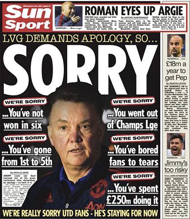 또한 언론과의 관계도 마찬가지였다. 다혈질적인 성격의 판 할 감독은 기자회견서 자주 민감한 모습을 노출해왔다. 특히 지난 시즌 뻥축구 논란이 일자 A4용지를 들고 오는 모습까지 보였다. 올 시즌에도 경질설이 제기됐던 12월 “나한테 사과할 사람은 없는가”라고 따졌고 최근 뉴캐슬전 이후 한 기자를 지목하며 ‘뚱보(fat man)'라고 지칭하기도 했다. 분명 일반적인 태도는 아니었다.