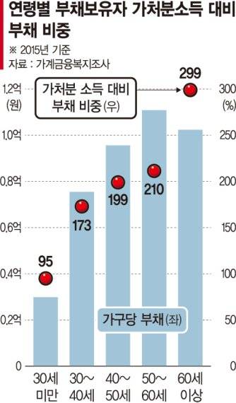 특히 노인들의 가처분소득 대비 부채 비중은 300%에 달하는 것으로 집계돼 우려를 키웠다. 빚이 있는 가구만을 점검한 결과, 60대 이상의 가처분소득 대비 부채비율은 299%에 달했다. 소비할 수 있는 돈을 100만원 갖고 있다면 빚은 300만원에 달한다는 얘기다.