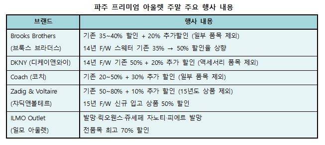 해외 유명 디자이너 브랜드부터 캐주얼, 남성, 아웃도어, 키즈 브랜드까지 220여 개의 다양한 브랜드 구성은 가족 모두가 즐거운 쇼핑을 즐기기에 부족함이 없다. 특히 최근에는 코트, 패딩 등 겨울 상품들을 추가로 할인하는 행사를 진행하고 있어 요즘 같이 쌀쌀한 날씨에 실속있는 쇼핑을 즐기기에 제격이다.