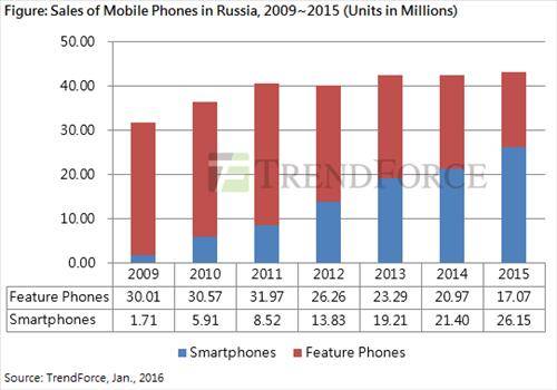 23일 시장조사보고서 트렌드포스에 따르면 2015년 러시아에서 판매된 스마트폰은 2천615만대로 2014년 2천140만대보다 22.2% 늘었다.