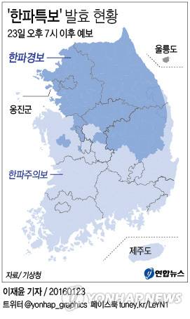제주지역에는 이날 오전 11시를 기해 한파주의보가 발효됐다. 제주에 한파 특보가 내려진 것은 2009년 3월13일 이후 약 7년 만이다. 제주에는 대설특보와 강풍·풍랑특보까지 발효됐다.