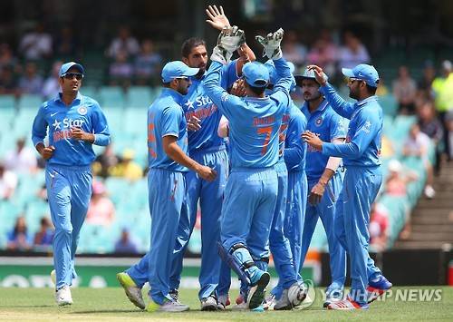 epa05120543 India's Ishant Sharma (3-L) celebrates with his teammates after Australia's Aaron Finch is dismissed for LBW during the fifth One Day International between Australia and India at the SCG in Sydney, Australia, 23 January 2016. EPA/DAVID MOIR -- IMAGES TO BE USED FOR NEWS REPORTING PURPOSES ONLY, NO COMMERCIAL USE WHATSOEVER, NO USE IN BOOKS WITHOUT PRIOR WRITTEN CONSENT FROM AAP -- AUSTRALIA AND NEW ZEALAND OUT -- EDITORIAL USE ONLY