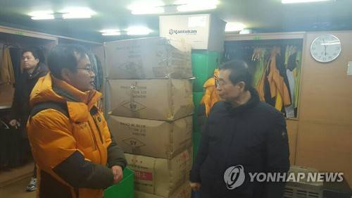 (서울=연합뉴스) 박원순 서울시장이 24일 새벽 한파 속 현장점검에 나서 시설물을 둘러보고 있다. 이날 서울시에 따르면 박 시장은 전날 오후 인천공항에 도착한 이후 이날 새벽까지 서울역 주변 노숙인 시설, 광화문 세월호 참사 추모시설, 주한일본대사관 앞 소녀상, 영등포역과 주변 쪽방촌 일대를 차례로 돌았다.