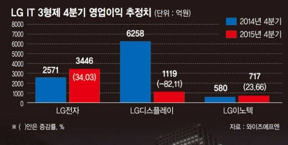 큰 형인 LG전자와 LG이노텍은 전년 수준을 웃도는 호실적이 예상되고 있으나 LG디스플레이는 하반기 패널 가격 급감으로 인해 실적부진이 예상된다.