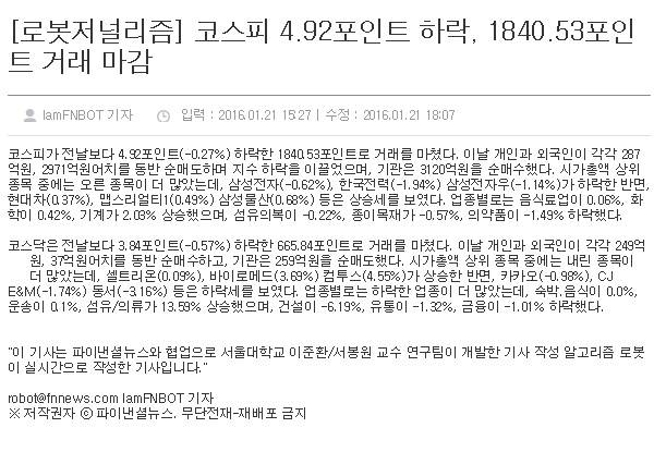 파이낸셜뉴스, 서울대 이준환·서봉원 연구팀과 첫 알고리즘 증권시황 기사 송고… 아직은 단순 정보 조합만