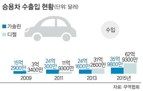무역협회가 통계를 내기 시작한 2007년 디젤 승용차 수입액은 2억4800만달러로 8년 새 수입액이 무려 25배나 늘어난 셈이다. 반면 2007년 디젤 승용차 수출액은 83억7900만달러로 같은 기간 실적이 뚝 떨어졌다.