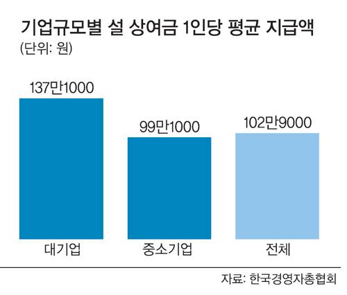조사 결과 설 상여금을 지급할 계획이 있는 기업은 73.8%로 지난해 78.1%보다 줄었다. 규모별로는 대기업이 전년 대비 1.2%포인트 줄어든 78.3%, 중소기업이 4.9%포인트 감소한 72.7%로 각각 나타났다. 상여금 지급기업의 근로자 1인당 평균 상여금은 102만9000원으로 지난해 100만2000원보다 2만7000원(2.7%) 늘었다. 연휴 일수는 평균 4.6일로 지난해 4.3일보다 0.3일 늘었다.