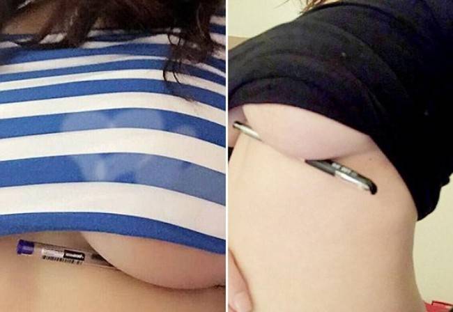 [헤럴드경제]쇄골에 동전을 올리고, 허리 뒤로 배꼽을 만지는 등 몸매를 뽐내기 위해 SNS 상에서 유행하던 포즈에 한 가지가 더 추가가 됐다. 바로 가슴에 펜 끼우고 인증샷 찍기가 또 한번 온라인 상에서 유행처럼 번지고 있다.