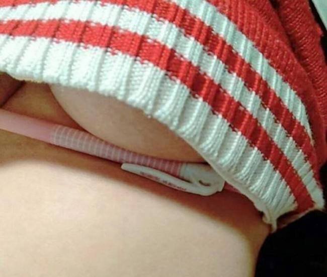 SNS에 올라온 사진 속 이 아찔한 인증 방식은 가슴 아래에 펜을 고정시킨 뒤 착용한 민소매를 살짝 들고 셀카를 찍는 것이 특징이다.