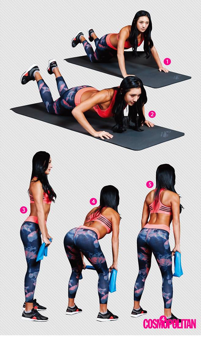 푸시업 로 효과 등 위아래 군살을 없애준다.1.양팔을 어깨너비로 벌려 손으로 바닥을 짚은 상태에서 무릎을 바닥에 댄 채 다리를 들어 올린다.2.허리가 굽어지지 않게 푸시업을 10회 반복한다.3.일어나서 밴드를 접어 팽팽하게 당기며 똑바로 선다. 이때 날개뼈가 모아지듯이 텐션을 잡는다. 밴드를 팽팽하게 당기는 것만으로도 등 전체에 자극이 느껴진다면 바른 자세다.4.무릎을 구부려 체중을 앞쪽으로 싣고 엉덩이를 살짝 뒤로 뺀다.5.그대로 무릎까지 내려갔다가 허리 힘을 사용하면서 위로 올라와 팔꿈치를 뒤쪽으로 한 번 더 당긴다. 10~15회씩 반복하고 1~5번까지 5세트 반복한다.