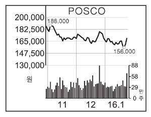 25일 유가증권시장에서 포스코 주가는 전날보다 5.59% 오른 17만원에 거래를 마쳤다. 원화값 약세로 연일 내리막길을 걷던 주가가 지난해 말 16만6500원보다 높은 수준으로 복귀한 것이다. 지난 21일 52주 신저가 15만5000원을 기록하는 등 연초 이후 주가가 6.6% 떨어지기도 했지만 지난 22일부터 분위기가 달라졌다.