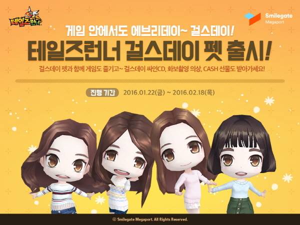 스마일게이트 메가포트(대표 이동훈)는 인기 온라인 액션 레이싱 게임 '테일즈런너(개발사 라온엔터테인먼트)'에 '걸스데이' 펫을 출시했다.
