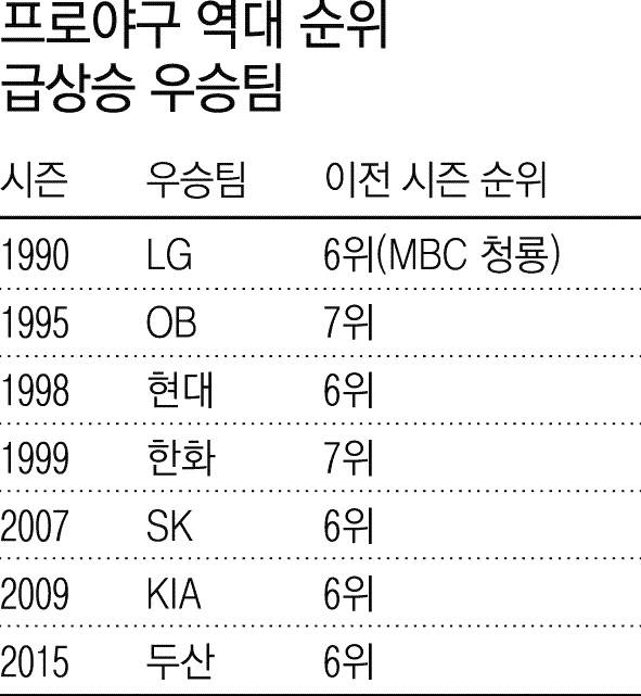 포스트시즌 진출에 실패했다가 이듬해 우승까지 오른 사례는 얼마나 될까. 단일 시즌제가 채택된 1989년 이후 지난해까지 27년간 이처럼 순위 급등팀이 탄생한 것은 모두 7차례였다.(표 참조)