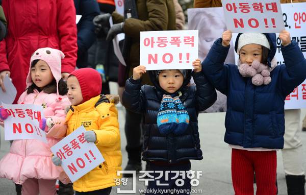 | 지난해 1월 한 어린이가 인천 송도센트럴파크 공원에서 아동학대를 반대하는 팻말을 들고 있다. / 김영민 기자 |