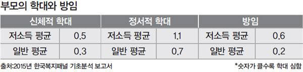 한국보건사회연구원이 발간한 <2015년 한국 복지패널 기초분석 보고서>는 오늘날에도 빈곤아동이 학대에 더 노출돼 있는 것은 마찬가지임을 증명한다. 보고서에 따르면 경제적 문제를 겪고 있는 저소득층 가정에서 학대가 더 빈번하게 발생하는 것으로 나타났다. 보고서는 학대의 유형을 신체적 학대, 정서적 학대, 방임의 세 가지 항목으로 나눠서 초등학교 4~6학년 458명을 대상으로 조사했다. 저소득층 기준은 총소득이 중위소득의 60% 이하인 가구다. 신체적 학대는 부모로부터 심하게 맞은 적이 있는지에 대해 0~4점(전혀 없었다: 0점, 1년에 1~2번: 1점, 2~3개월에 1~2번: 2점, 한 달에 1~2번: 3점, 일주일에 1~2번: 4점)의 점수를 부여했다. 저소득가구의 아동은 0.5점, 일반가구의 아동은 0.3점으로 저소득가구 아동이 신체적 학대에 더 노출된 것으로 나타났다. 비율로 따지면 40%가 더 높다.