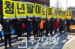 | 1월 14일, 서울 청운동주민센터 앞에서 열린 박 대통령 대국민 담화 규탄 기자회견에서 참석자들이 ‘청년 팔아 노동개악 반대’라고 적힌 플래카드를 들고 있다. / 정지윤 기자 |