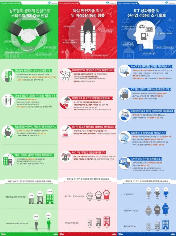 미래부는 창조경제를 통한 성장동력 창출을 가속화하기 위해 △스타트업 7대 강국 진입 △핵심 원천기술 확보 및 미래성장동력 창출 △ICT 성과창출 및 신산업 경쟁력 조기 확보 △과학기술 및 ICT 글로벌 확산 등 4대 전략을 도출했다.