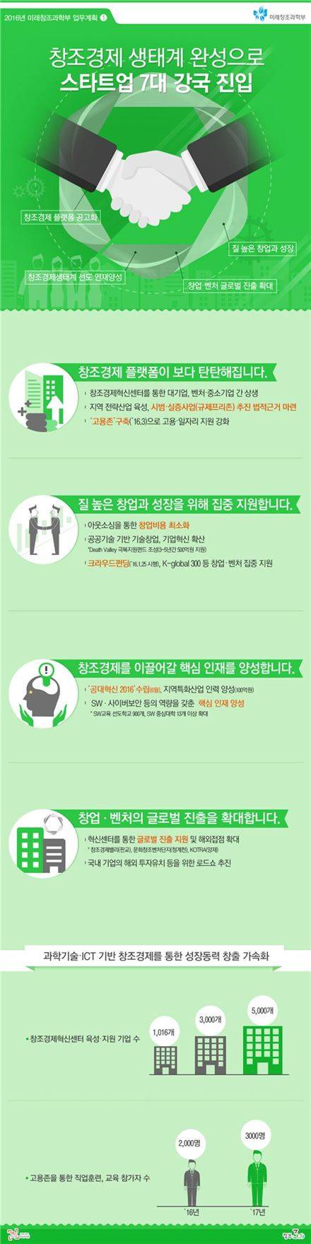 미래부는 도전적인 국제환경 속에서 창조경제를 통한 성장동력 창출을 가속화하기 위해 스타트업 7대 강국 진입, ICT 성과창출 및 신산업 경쟁력 조기 확보 등의 전략을 세웠다.