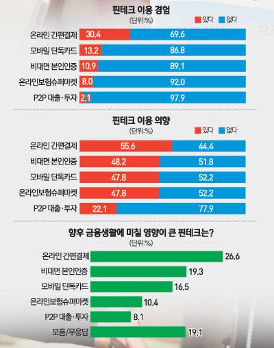실제로 설문조사 결과를 살펴보면 5개의 핀테크 서비스 중 인지도나 이용 경험 및 이용 의사 면에서 간편결제가 모두 1위를 차지했다. 먼저 '핀테크 관련 서비스별 이용 경험'을 물어본 결과 온라인 간편결제 이용률이 30.4%로 가장 높았고 다음으로 모바일 단독 카드가 13.2%, 비대면 본인인증이 10.9%로 뒤를 이었다. 온라인 보험슈퍼마켓은 8.0%, P2P 대출·투자는 2.1%에 그쳤다. 온라인 간편결제가 그나마 이용 경험이 높았지만 거꾸로 생각해보면 적어도 70% 이상의 국민들은 핀테크 서비스를 단 한 번도 이용해본 적이 없는 셈이다.