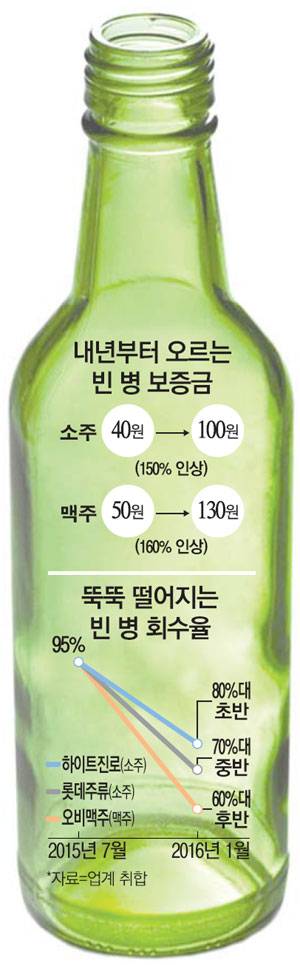 27일 주류업계에 따르면 각 제조사가 주류 제조를 위해 거둬들이는 빈 병 회수율은 현재 60~80%대로 뚝 떨어졌다. 애초 환경부 인상안이 나오기 전 국내 소주·맥주 빈 병 회수율은 95%에 달했지만 올해 1월 현재 하이트진로 소주는 80%대 초반, 롯데주류 소주는 70%대 중반, 오비맥주는 60%대 후반으로 감소했다. 그나마 맥주는 캔과 병 비중이 5대5 정도여서 빈 병 회수율이 낮더라도 큰 타격은 없지만 유리병에 주로 의존하는 소주업계는 발등에 불이 떨어졌다.