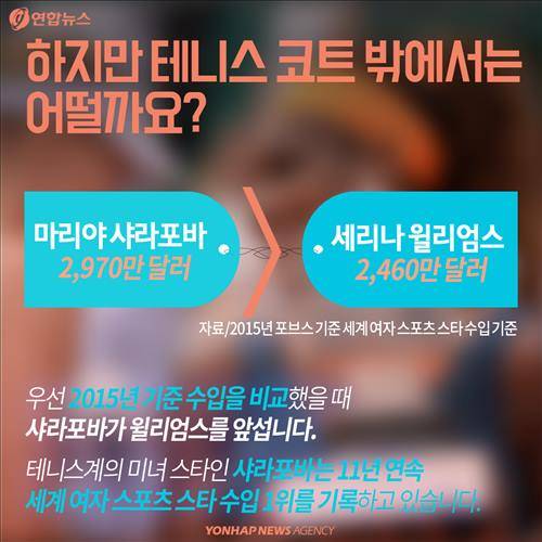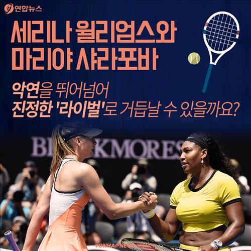 (서울=연합뉴스) 디지털뉴스부 = 여자 테니스 세계랭킹 1위 세리나 윌리엄스와 미녀 스타 마리야 샤라포바의 대결은 언제나 스포츠 대결 이상의 묘미로 관심을 끕니다. 최근 호주오픈 여자 단식 8강전에서는 윌리엄스가 샤라포바에게 2-0 완승을 따냈습니다. 샤라포바에게는 2004년 윔블던 결승전 승리 이후 18연속 패배였습니다. 하지만 샤라포바는 여자 스포츠 스타 수입 1위 타이틀을 11년째 지키고 있습니다. 앙숙 같은 둘의 관계를 카드뉴스로 정리했습니다.