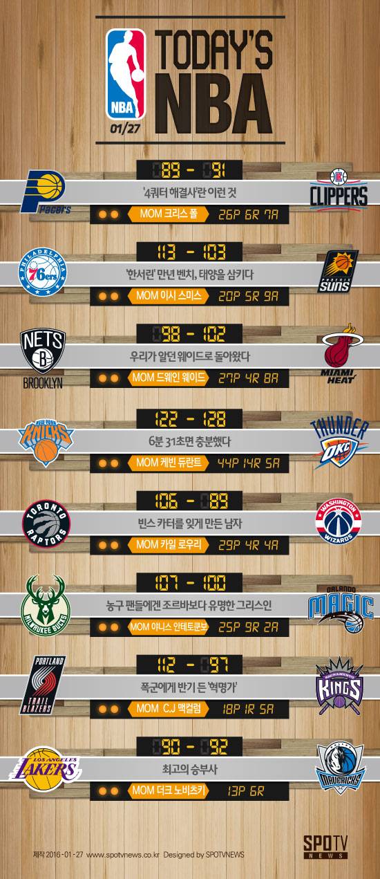 오클라호마시티는 27일(한국 시간) 뉴욕주 뉴욕 매디슨 스퀘어 가든에서 열린 2015~2016 미국 프로 농구 뉴욕 닉스와 원정 경기에서 128-122로 이겼다.