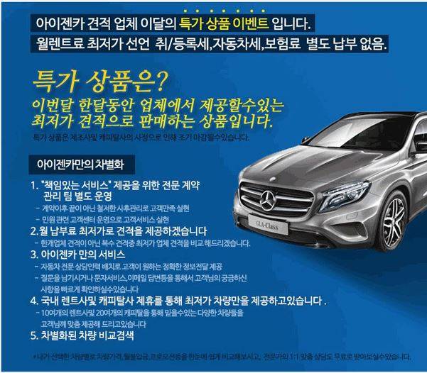 장기렌트카가격비교와 자동차리스, 중고차 [아이젠카]에서 롯데렌터카, aj렌터카, 캐피탈사 통합가격비교로 인기.