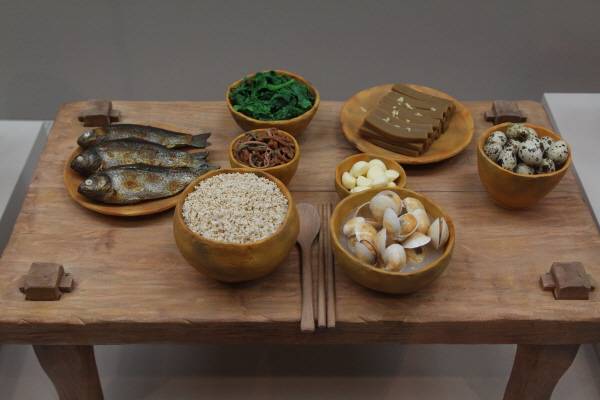 토기 옆에 있는 대평인의 밥상은 요즘의 웰빙 밥상 같다. 조밥과 조갯국에 민물생선구이 나물, 마늘 반찬, 도토리묵 등이 차려져 있다. 이 모두를 한 상 가득 차려 늘 먹지는 못했겠지만 아이는 치킨이 왜 없는지, 돼지고기가 없는지 아쉬워했다.
