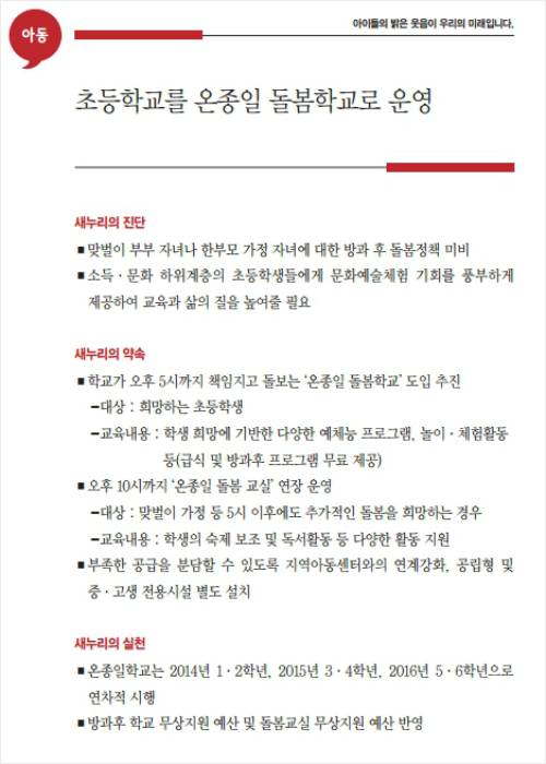 박 대통령은 후보 시절인 2012년 "초등학교에서 온종일 학교를 운영하겠다"며 "방과후에는 보살핌을 받지 못하는 초등학생들이 안전한 학교에서 다양한 체험활동을 할 수 있도록 하겠다"고 공언했다.