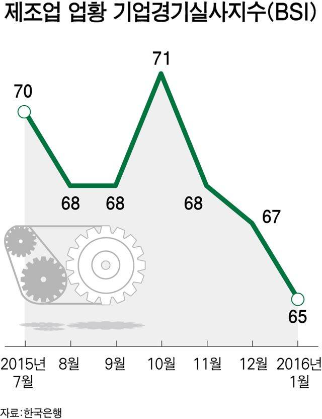 한국은행이 29일 발표한 1월 제조업의 업황 기업경기실사지수(BSI)는 65로 작년 12월보다 2포인트 떨어졌다. 지난해 10월(71) 이후 3개월 째 내리막으로, 중동호흡기증후군(메르스) 사태의 타격이 컸던 지난해 6월(66)보다도 낮은 수치다. 특히 글로벌 금융위기의 직격탄을 맞았던 2009년 3월(56) 이후 6년10개월 만에 최저치를 기록했다.
