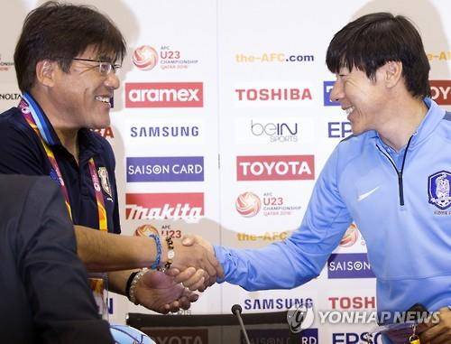 (도하=연합뉴스) 고일환 기자 = 2016 아시아축구연맹(AFC) U-23 챔피언십 결승에서 만난 한국과 일본의 감독이 공식기자회견에서 날카로운 비수를 숨기고 미소만 교환했다.