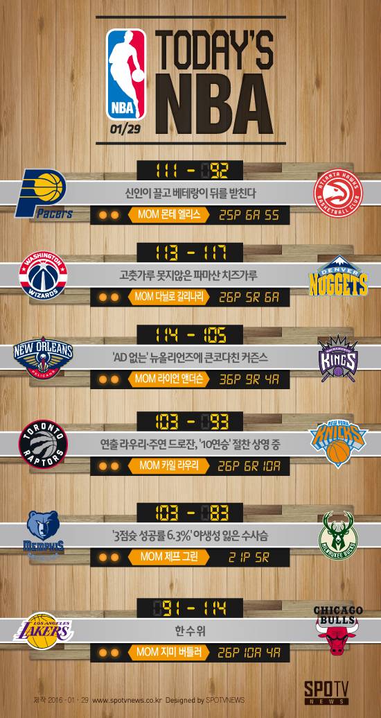 시카고는 29일(한국 시간) 캘리포니아주 로스앤젤레스 스테이플스 센터에서 열린 2015~2016 미국 프로 농구 LA 레이커스와 원정 경기에서 114-91로 이겼다.