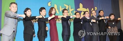(대전=연합뉴스) 이재림 기자 = 30일 오후 대전 서구 누보스타컨벤션에서 열린 '더불어민주당 토크콘서트에서 최근 영입한 표창원 전 경찰대 교수, 양향자 전 삼성전자 상무, 김빈 빈 컴퍼니 대표 등 참석자들이 포즈를 취하고 있다. 2016.1.30